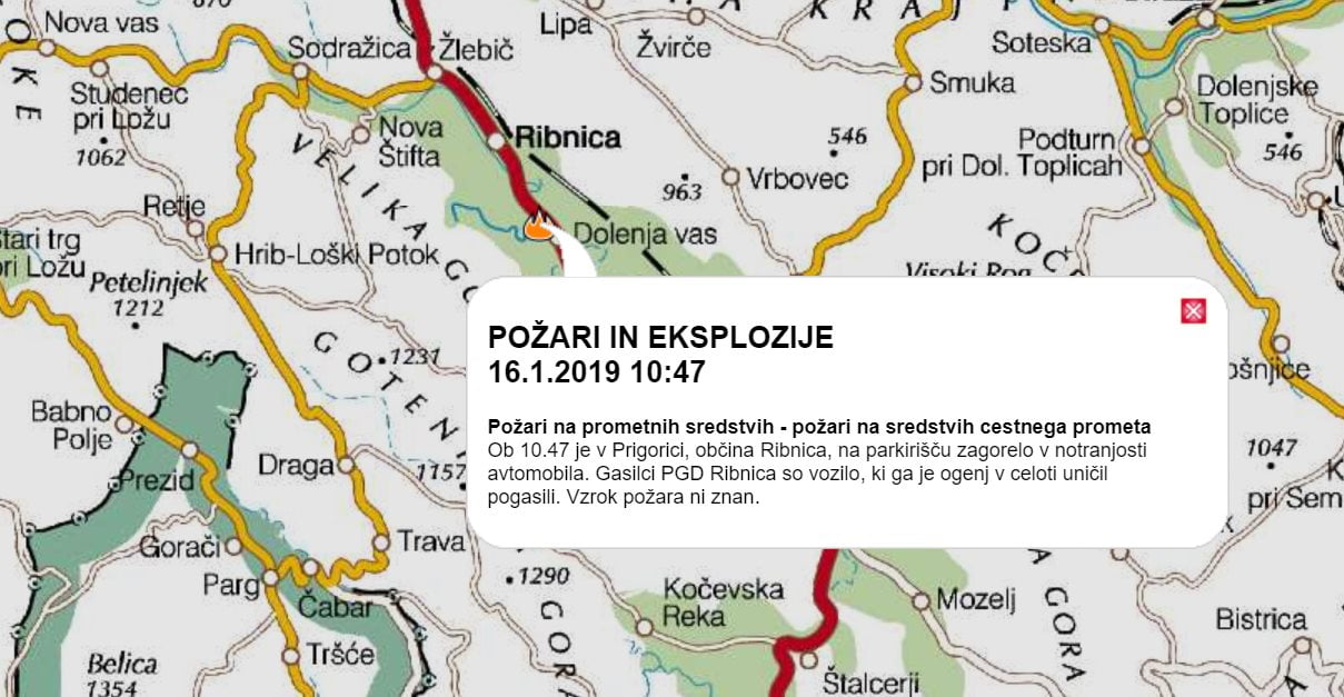 Prigorica – V sredo, 16. januarja 2019 ob 10.47 je v Prigorici, občina Ribnica, na parkirišču zagorelo v notranjosti avtomobila. Gasilci PGD Ribnica so vozilo, ki ga je ogenj v celoti uničil pogasili. Vzrok požara ni znan.
