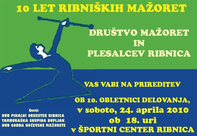 Vabljeni na prireditev ob 10 letnici delovanja Društva mažoret in plesalcev Ribnica, ki bo v soboto, 24. aprila, ob 18. uri v Športnem centru Ribnica.