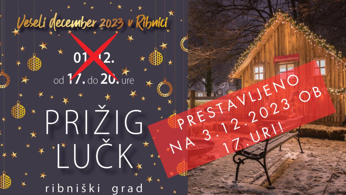 Prižig lučk v Ribnici je zaradi slabe vremenske napovedi prestavljen iz 1.12.2023 na 3.12.2023, tako bo Ribnica v soju prazničnih luči zažarela v nedeljo, 3. decembra, ob 17. uri s prižigom lučk v ribniškem gradu. Spremljal ga bo otroški animacijski program, na stojnicah bo na voljo praznična, darilna ponudba in zadišalo bo po decembrskih dobrotah. Najmlajši bodo lahko ustvarjali na otroških delavnicah in v Pravljični hiški poslušali pravljice iz Knjižnice Miklova hiša. Za popestritev večera bo z glasbeno bonboniero poskrbela skupina Koral 45 lightning.