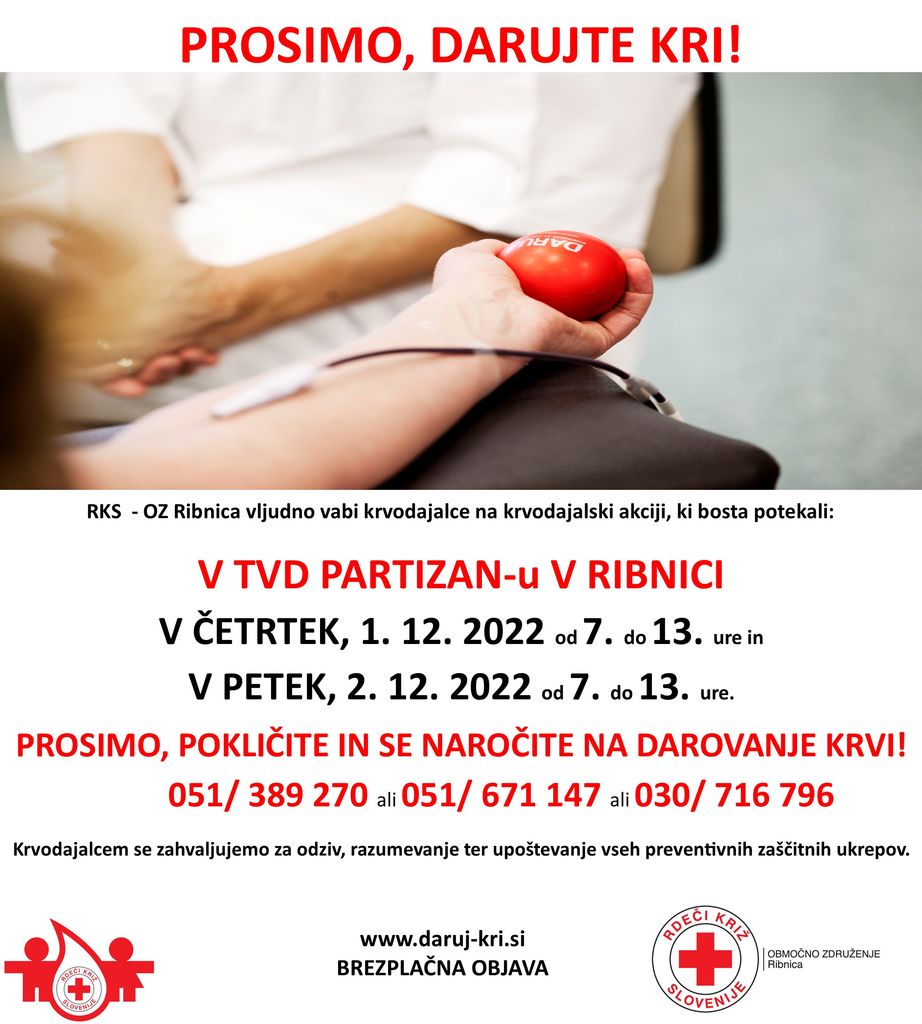 Vabilo na krvodajalsko akcijo v TVD Partizan Ribnica (1. in 2. 12. 2022)